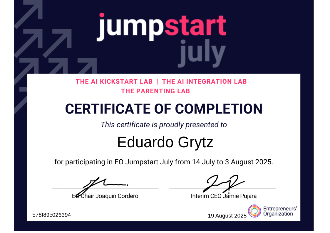 Jumpstart July 2025 was a three-week, high-impact virtual learning experience designed to help EO community members develop skills they could immediately apply to their personal and professional lives. Hosted as part of EO’s Jumpstart program, this edition featured three focused learning tracks: The AI Kickstart Lab, The AI Integration Lab, and The Parenting Lab—each combining expert-led workshops, interactive coaching, and member-facilitated breakout discussions.